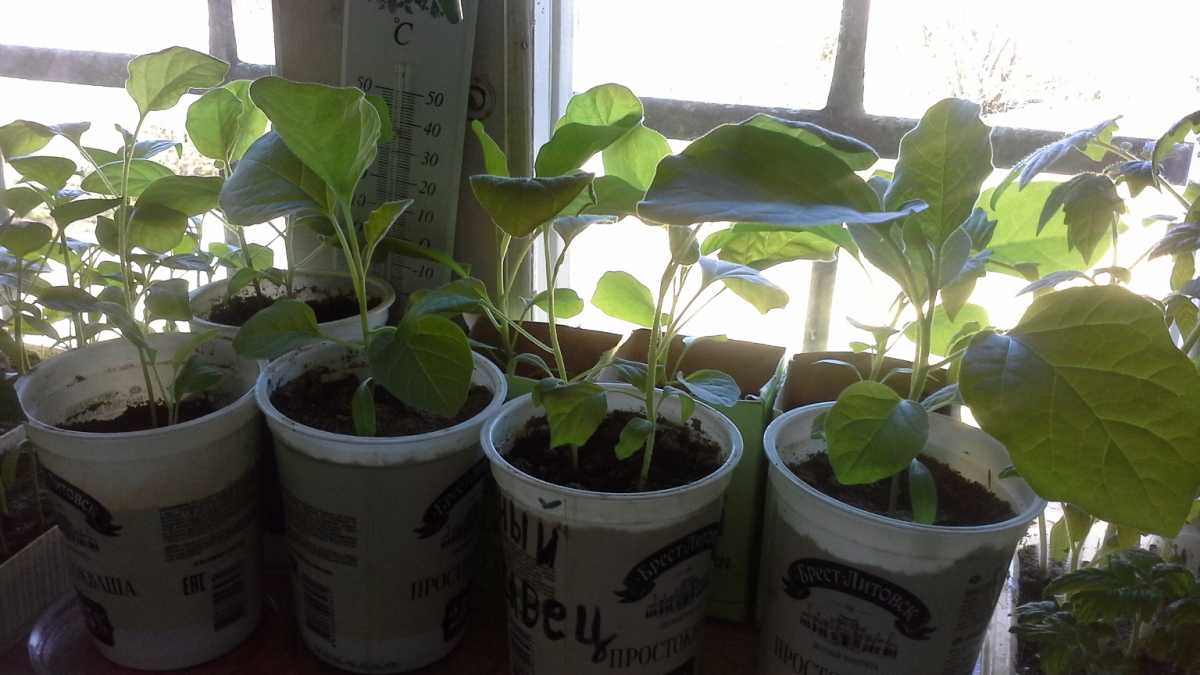 Перед высадкой на постоянку (за 2 недели) приучаю растения к новым условиям окружающей среды. Постепенно уменьшаю частоту полива, снижаю температуру в помещении, для чего тару с рассадой баклажанов выношу в коридор или на застекленный балкон, лоджию. Вначале рассаду выдерживаю 2-3 часа, постепенно оставляя на более длительный срок в прохладном помещении. Если недостаточно освещения в коридоре включаю досвечивание.