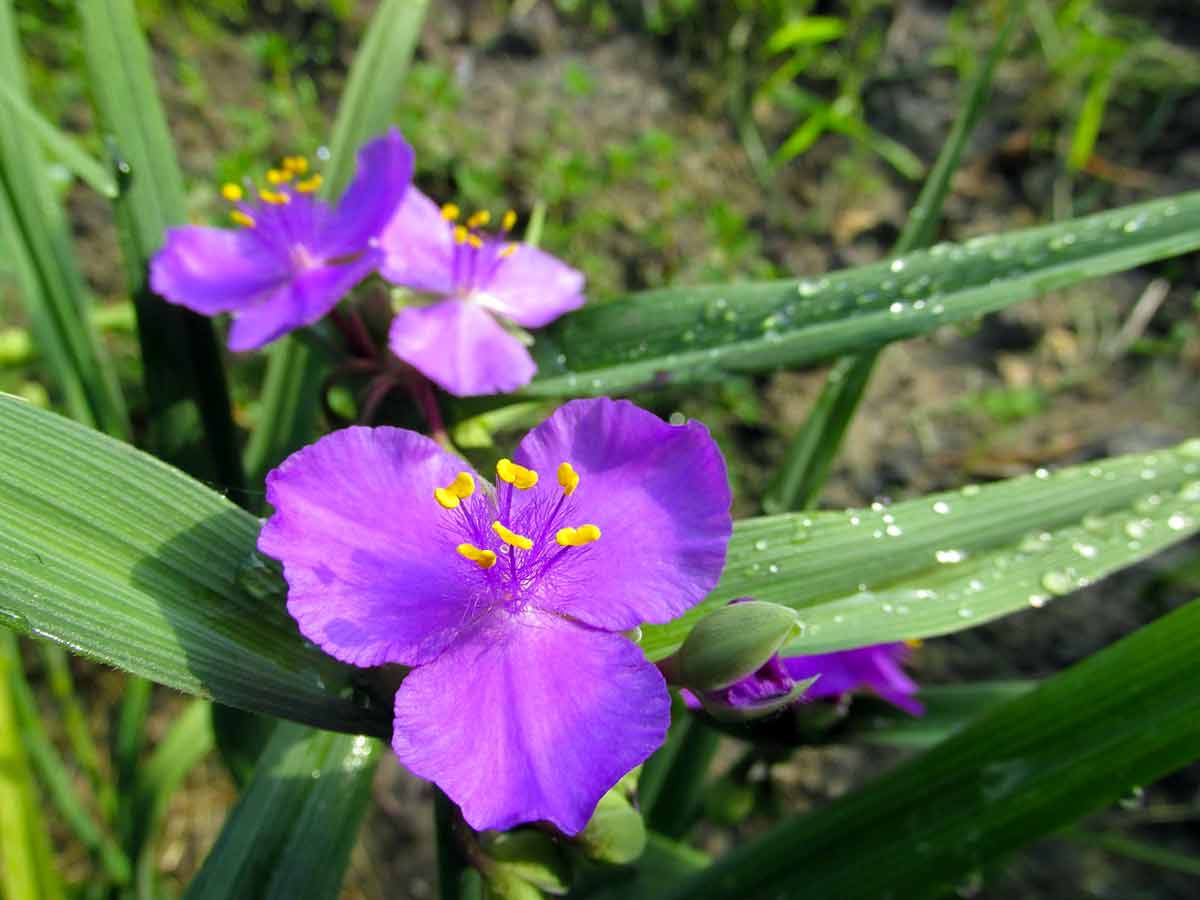 Традескация виргинская является невысоким растением с линейными листьями темно-зеленого цвета и прочными цветоносами до пятидесяти сантиметров высотой. На их кончиках образуются красивые цветы ярко-синей или фиолетовой окраски с тычинками яркого оранжевого цвета увидеть которые Вы сможете на фото. Каждый из них цветет в течение суток, а на смену распускаются новые.