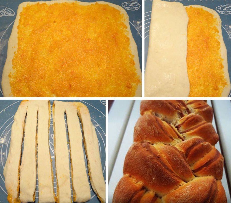 - Поднявшееся тесто раскатывают на столе, подсыпая муку, чтобы оно не прилипало. Выкладывают и распределяют прослойку. Заворачивают сначала 1/3 теста слева, чтобы тыква осталась внутри. Повторяют эту же процедуру справа. Затем складывают еще раз уже другую сторону, чтобы получился квадрат. Тесто становится девятислойным. Его разрезают вдоль на 2 части, а затем каждую из них на 3 полоски не до конца.