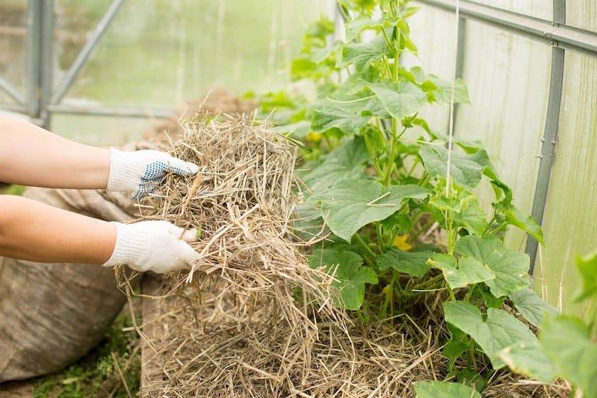 Если вы не можете поливать огурцы в поликарбонатной теплице чаще, чем раз в неделю, то просто мульчируйте посадки любой имеющейся органикой. Для этого можно использовать торф, зрелый компост, солому, подсушенную на солнце траву без сорных семян и так далее. Чтобы эффективно замедлить испарение влаги, слой мульчи должен быть не менее 5-6 сантиметров.